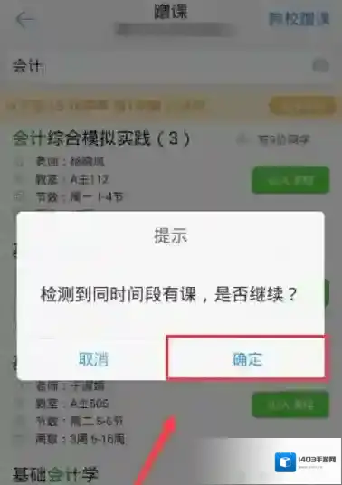 6、这里的提示就是说明我们现在上的课程和我们蹭课的课程有时间的冲突,这里我们可以选择其他的课程,来错过时间,如果没影响的就点击确定就可以了。