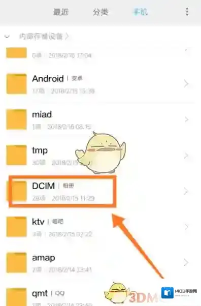 5.在手机内部存储设备里找到名为“DCIM”的文件夹;