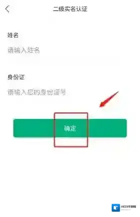 4、在二级实名认证页面输入自己的姓名和身份证号,点击”确定“。