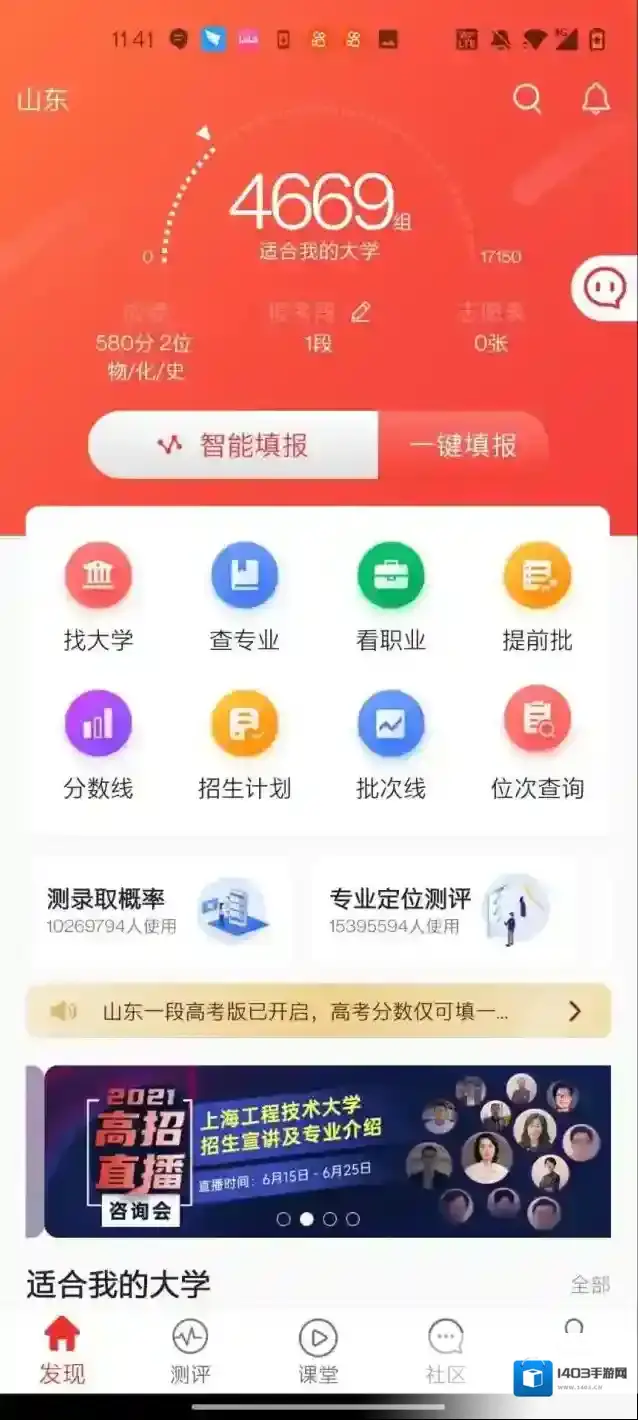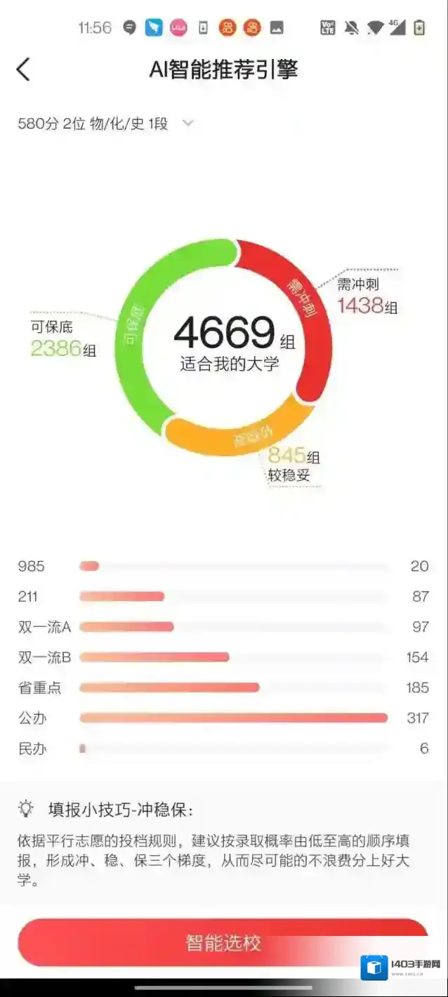 5、点击智能填报,软件会自动根据我们的分数来筛选适合我们的学校。