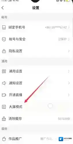 4、点击大屏模式,点击开启大屏模式即可开启观看全屏,重复同样的操作也可以关闭大屏模式。