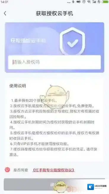 3.在获取授权云手机界面,输入正确的授权码,仔细阅读《红手指专业版授权协议》后,点击确认即可获得对应云手机的使用权。