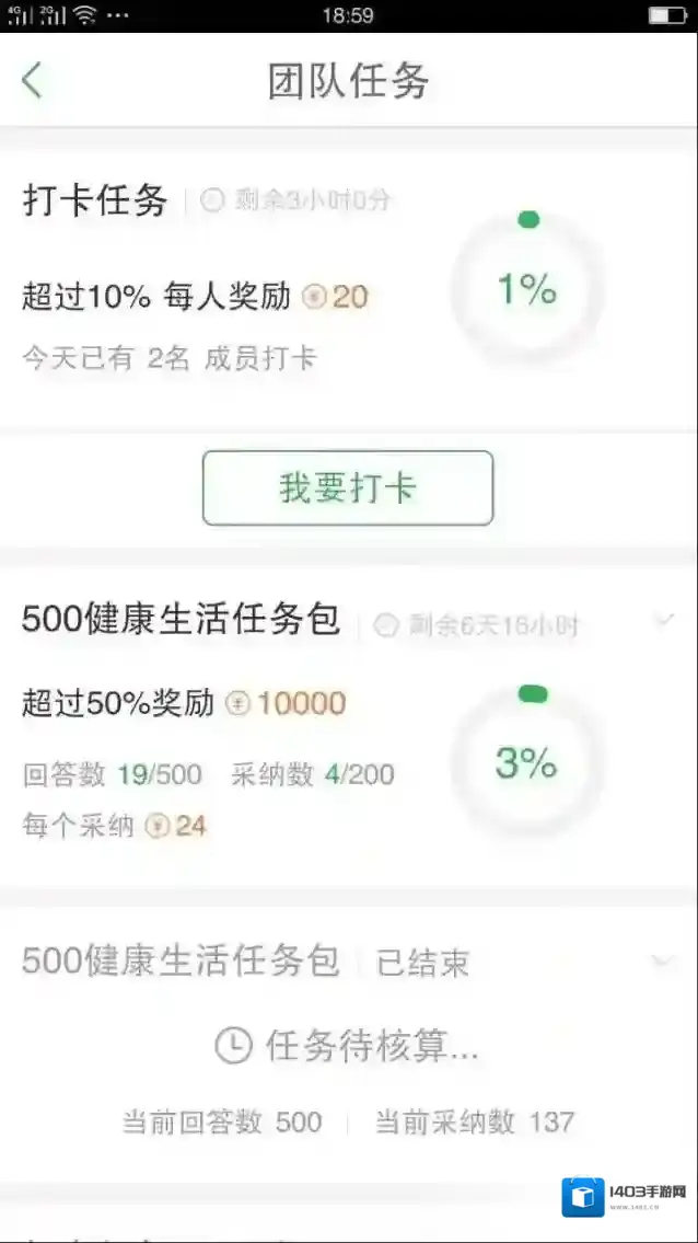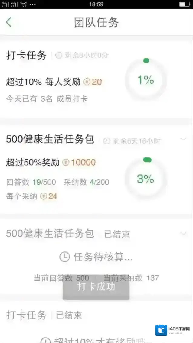 5、在“团队动态”的上方是进行团队的打卡,点击“健康生活新手8”这个团队就可以进到打卡的页面,在右上方的中间打√图标就是打卡的,如下图所示: