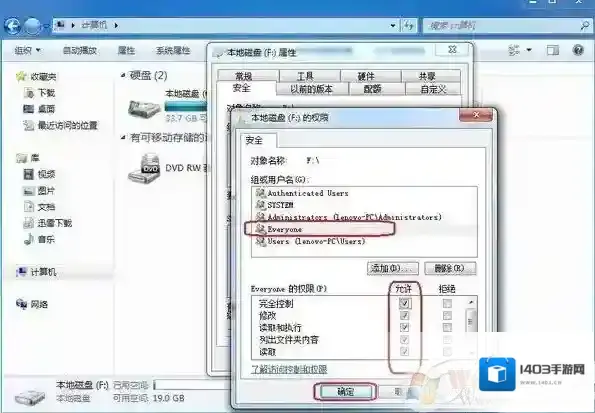 6、返回到“本地磁盘(F:)权限”界面后,勾选“完全控制”或者其他选项,完成后单击“确定”,权限设置就完成了。