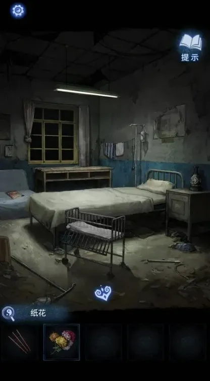 13、点击窗台旁,桌上的报纸触发动画,动画结束后在推车上获得花,将花插病床旁的花瓶,触发动画。动画结束后获得笔和墨盒。