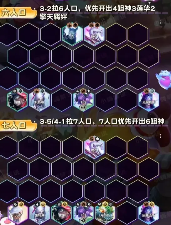 3-2拉6人口,3-5/4-1拉7人口,中期尽量补充4狙神3莲华2狙神羁绊,如果能够拿到艾希,直接开出3莲华6狙神羁绊