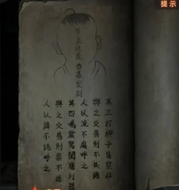 再查看一下左边八不郎,其实不是很重点,后面要用到的时候都会有对应提示的,第三页有个发髻小小的的小人,记下来脸上写的“节哀顺变恭喜发财”,那么我们现在白衣人的线索也齐了,回去调整,注意最下面露出来的头发对应对联位置哦,调整完毕之后白衣人也退散了。