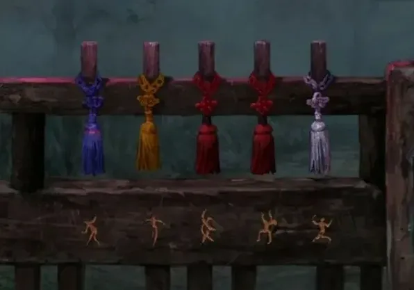 查看一家人左边的栏杆,发现有跳舞小人,上面挂着的挂穗还是不同颜色的,这个不就是广场舞姿势么?不过姿势的顺序和广场舞跳的顺序是一样的,也就是我们按照广场舞灯的颜色蓝黄红红白来调整就能完成了,完成后下面篮子拿到一辆小汽车。