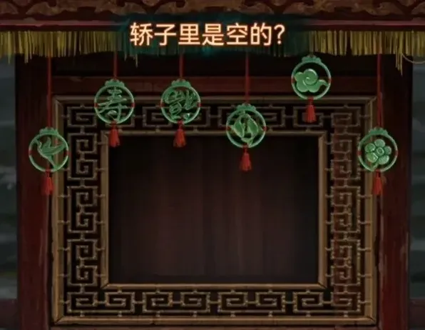 先查看一下轿子不让掀开帘子,那查看一下左边的桌子,使用金元宝后玩一个叠叠乐小游戏,将所有元宝都移动到中间画有元宝图案的地方,完成后下面布条打开,观察一下布条大概是有四种高度的,最高的是云,第二高的是福寿,第三高的是1,最下面的是花鸟,记下来再次查看花轿调整到同高度。