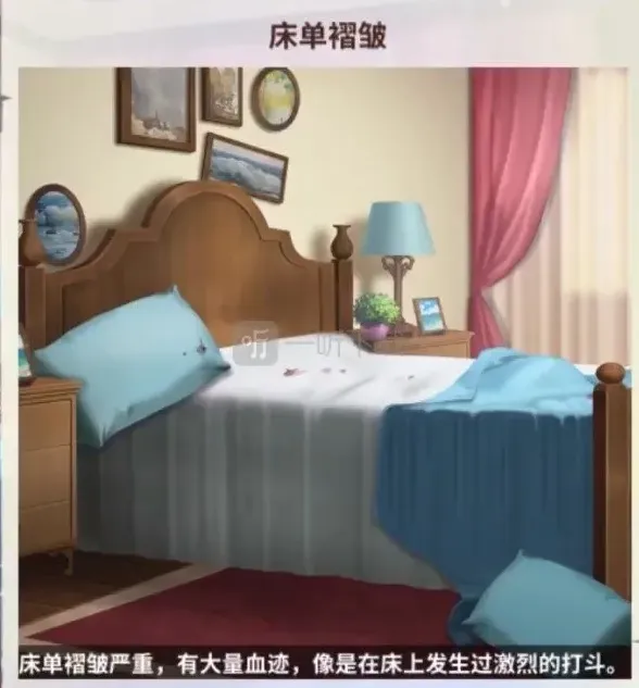 床上有血迹和打斗的痕迹,然而死者被杀,看的出来凶手力气很大,女生的嫌疑是比较小的。