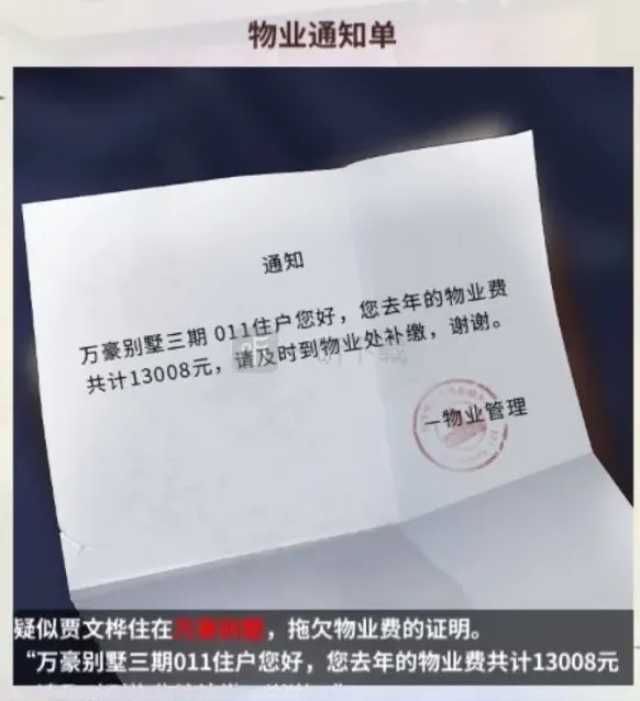 里边有两个催租信息,一个是房东通知单,欠了一个季度的房租,看起来挺缺钱的,另一个是物业费没交,可以分析出来死者很缺钱,应该是工作出现了什么问题。