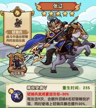 3、张辽,暴击率是轻骑兵的核心属性,不论是卡牌还是宝石,都很依赖暴击率来触发效果。张辽的存在能让轻骑兵的暴击率几乎达到百分百,同时还能提供大量暴击伤害增益。暴击伤害在后期是远超百分比伤害的一种属性,其稀缺性可想而知。张辽是轻骑兵阵容不可或缺的核心一环,有了他,轻骑兵的输出才能达到极限。