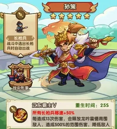 3、孙策,作为单体输出最高的兵种,长枪兵的连击和血爆是非常强力的卡牌;而在兵营18级时,还会解锁狂暴之枪这一超模卡牌,可以完美适配各类卡牌与宝石增益,这一切都与攻速息息相关,而孙策恰好能提供攻速这一稀缺属性。攻速是万金油属性,能对所有兵种提供稳定的增伤,由于孙策长枪兵的特性,增益效果几乎是全程持续。在大量攻速加持下,长枪兵的血爆和狂暴状态能够多次触发,续航和爆发足以产生质变。