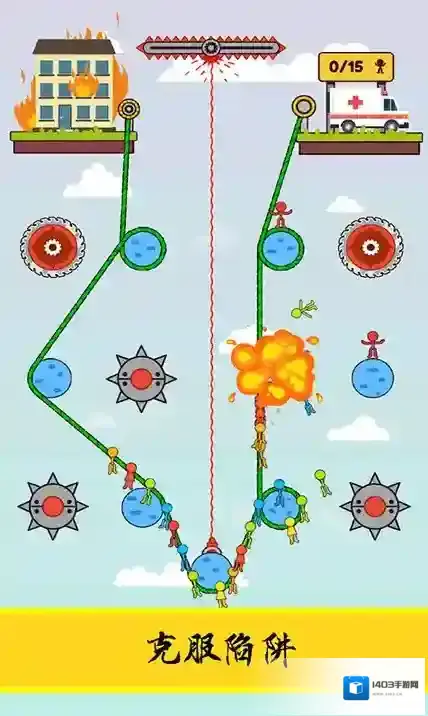 3、救援操作控制:被困人员移动时需实时调整绳索张力,遇到障碍物时可点击屏幕让其跳跃或攀爬,部分关卡需同时控制多名人员。