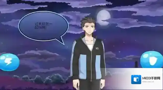 2、画面中是一个穿着运动服的男性角色,营造互动情境,左右两侧分别有蓝色闪电(代表行动或攻击类选项)和蓝色盾牌(可能代表防御或回避类选项)图标。