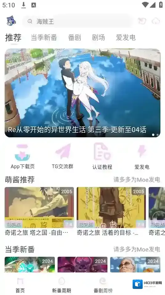 1、首页为大家推荐了很多不同类型的动漫,当季新番、番剧以及剧场等。