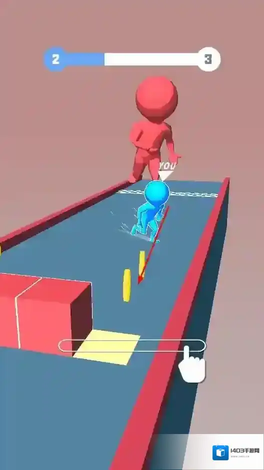 1、进入游戏后通过滑屏控制蓝色火柴人左右移动,在赛道上快速奔跑,第一时间避开前方出现的木箱、陷阱等障碍物。