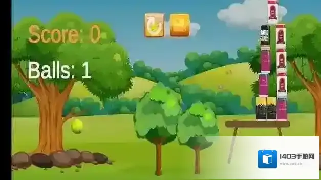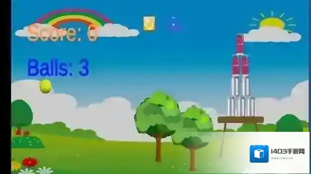 2、按手指滑动提示操控网球,瞄准易拉罐堆击打,利用3个初始球,打破易拉罐获分数。