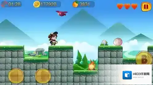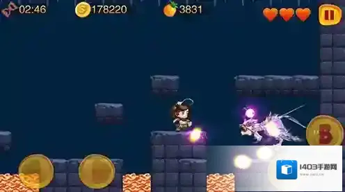 3、通过屏幕下方【A】【B】按键操控角色,收集金币,橙子等,注意躲避障碍和获取道具。