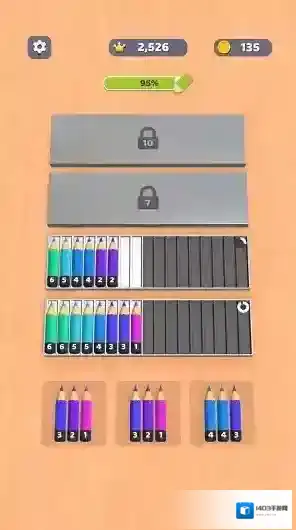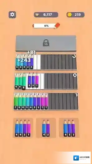 2、观察关卡中的铅笔分布,优先移动阻塞关键路径的铅笔,利用提示功能获取最优排序方案。